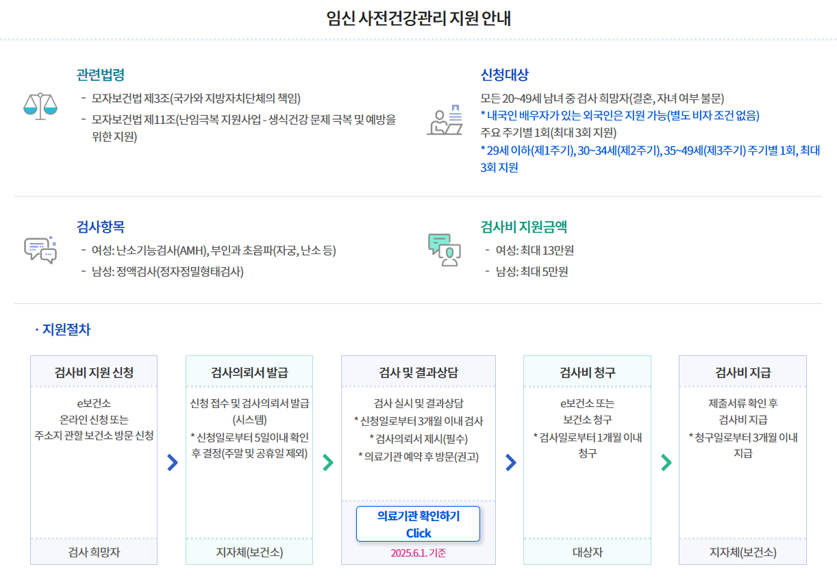 e-보건소를 통한 임신사전건강관리 지원(https://www.e-health.go.kr/gh/caSrvcGud/selectMdclSupGudInfo.do?heBiz=PG00003&menuId=200097)은 매우 간단하다. 해당 사이트에 들어가 스크롤을 내려 동의를 모두 한 다음에 간편 인증 후 입력을 하면 보건소에서 신청 내역을 보고 승인을 해준다. 그럼 그 승인 내역을 가지고 의료기관(사전검사 사업을 수행하는 기관인지는 확인이 필요함, 수행기관인 것만 확인된다면 전국 어느 병원에서도 가능함)에서 검사한 뒤, 1개월 내에 꼭 청구를 진행해야지만 돈을 받을 수 있다. 최근 예산이 조기마감되는 경우도 많고 미혼도 지원된다고 하니, 결혼생각이 있으면 연초에 진행하는 것도 괜찮을 것으로 보인다.